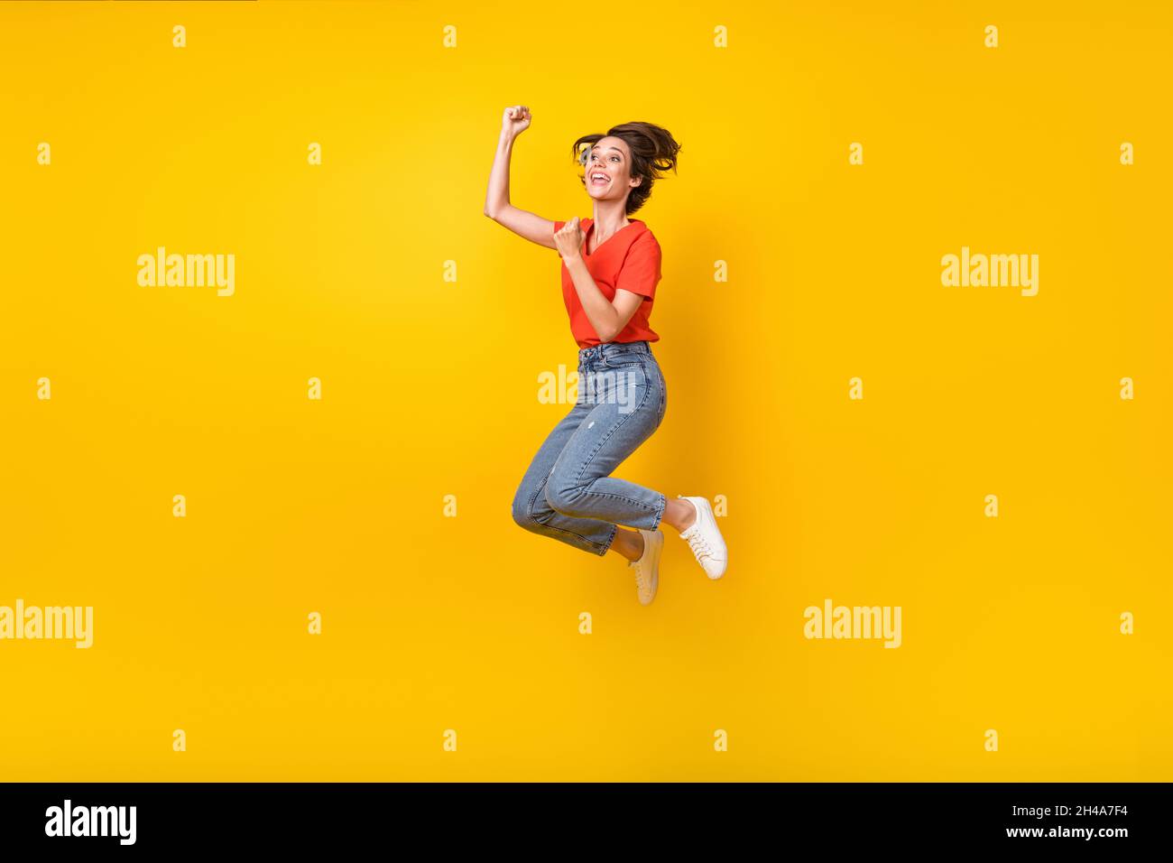 Full Size Profile Photo Of Hooray Brunette Short Hairdo Lady Jump Wear T Shirt Jeans Sneakers is a popular picture for sexy and hot.
