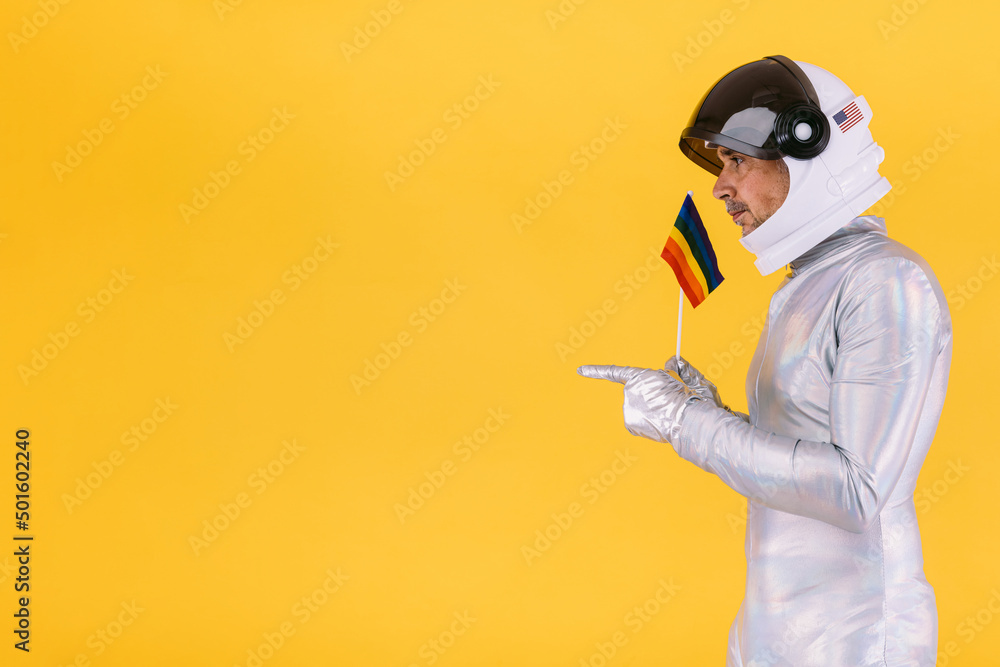 Gay Man Dressed As An Astronaut With A Helmet And Silver Suit With A Flag Of The Lgtbi pictures has 500 x 400 · 50 kB · jpeg.