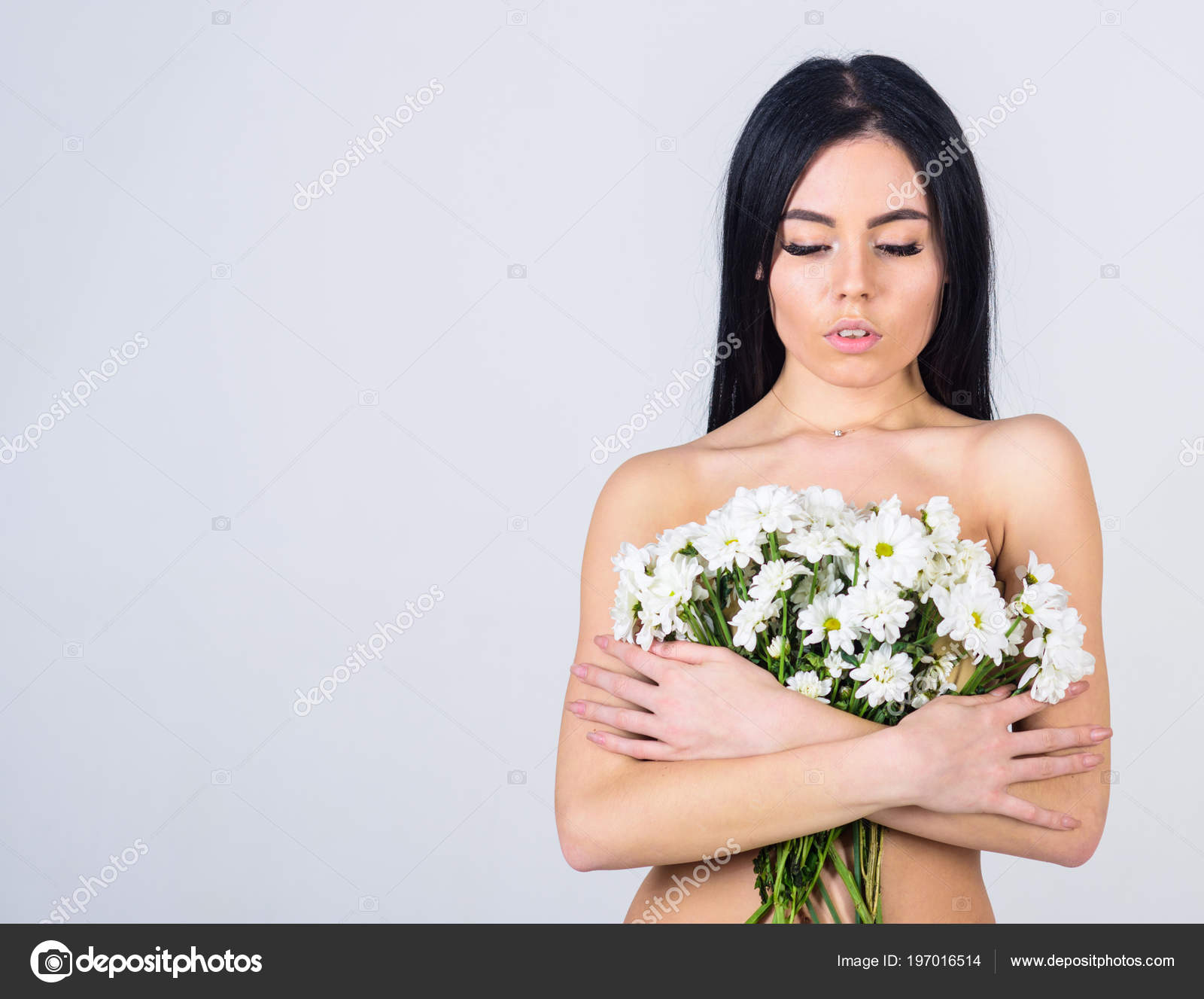 Girl On Calm Face Stands Naked And Holds Chamomile Flowers In Front Of Chest Lady Covers is a popular picture for sexy and hot.