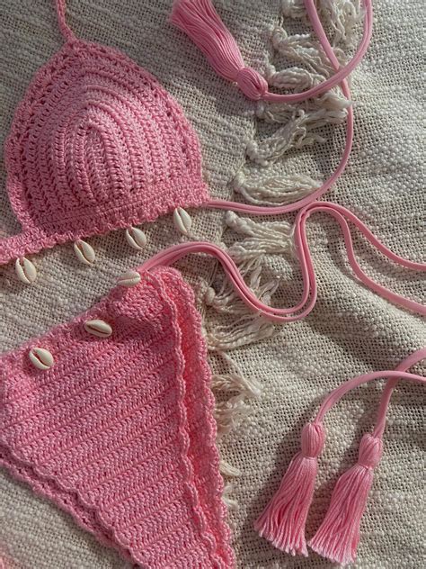 Gorgeous White And Pink Crochet Bikini With Pearl Depop