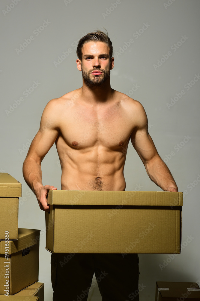 Guy With Sexy Naked Torso Holds Box In Hands Stock Photo Adobe Stock is a popular picture for sexy and hot.