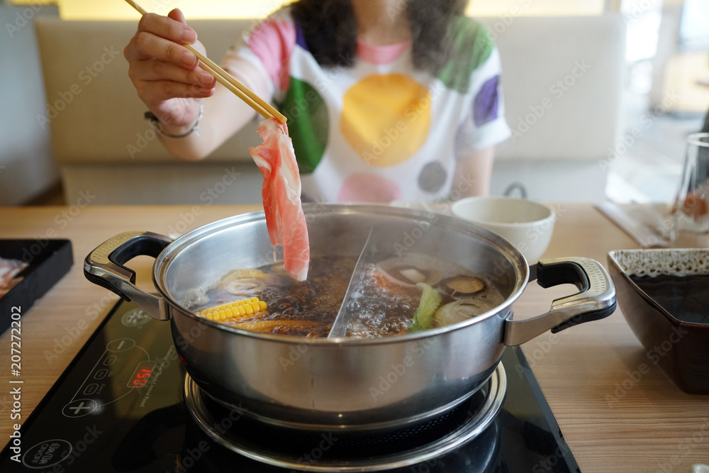 Tag : Hand Holding Raw Sliced Pork Using Chopsticks On Hot Pot With Smoke For Japanese Hot Pot Also