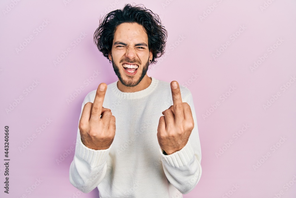 Tag : Handsome Hispanic Man Wearing Casual White Sweater Showing Middle Finger Doing Fuck You Bad