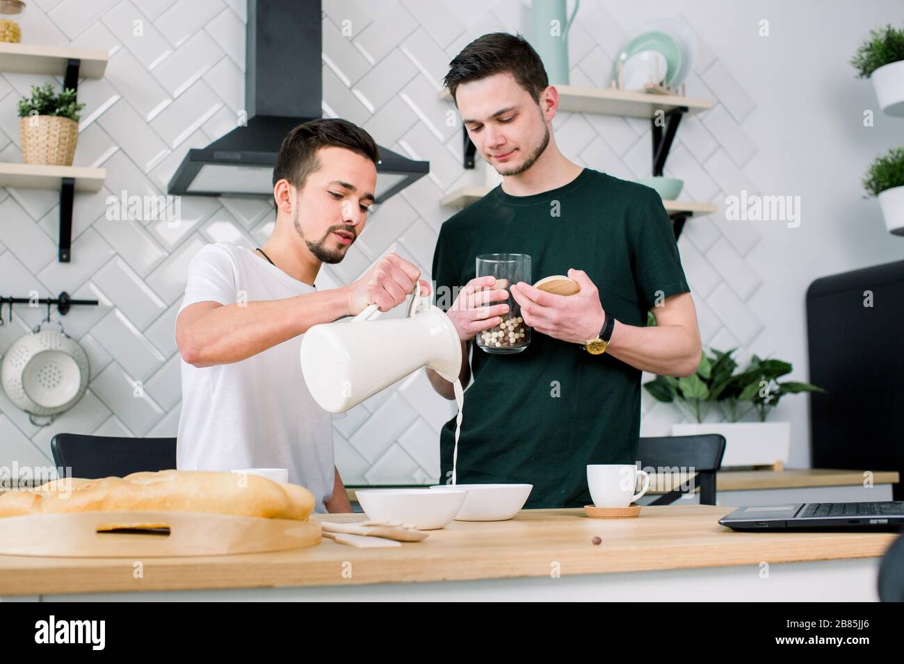 Tag : Happy Gay Couple Preparing Breakfast In Kitchen At Morning Handsome Man Putting Breakfast