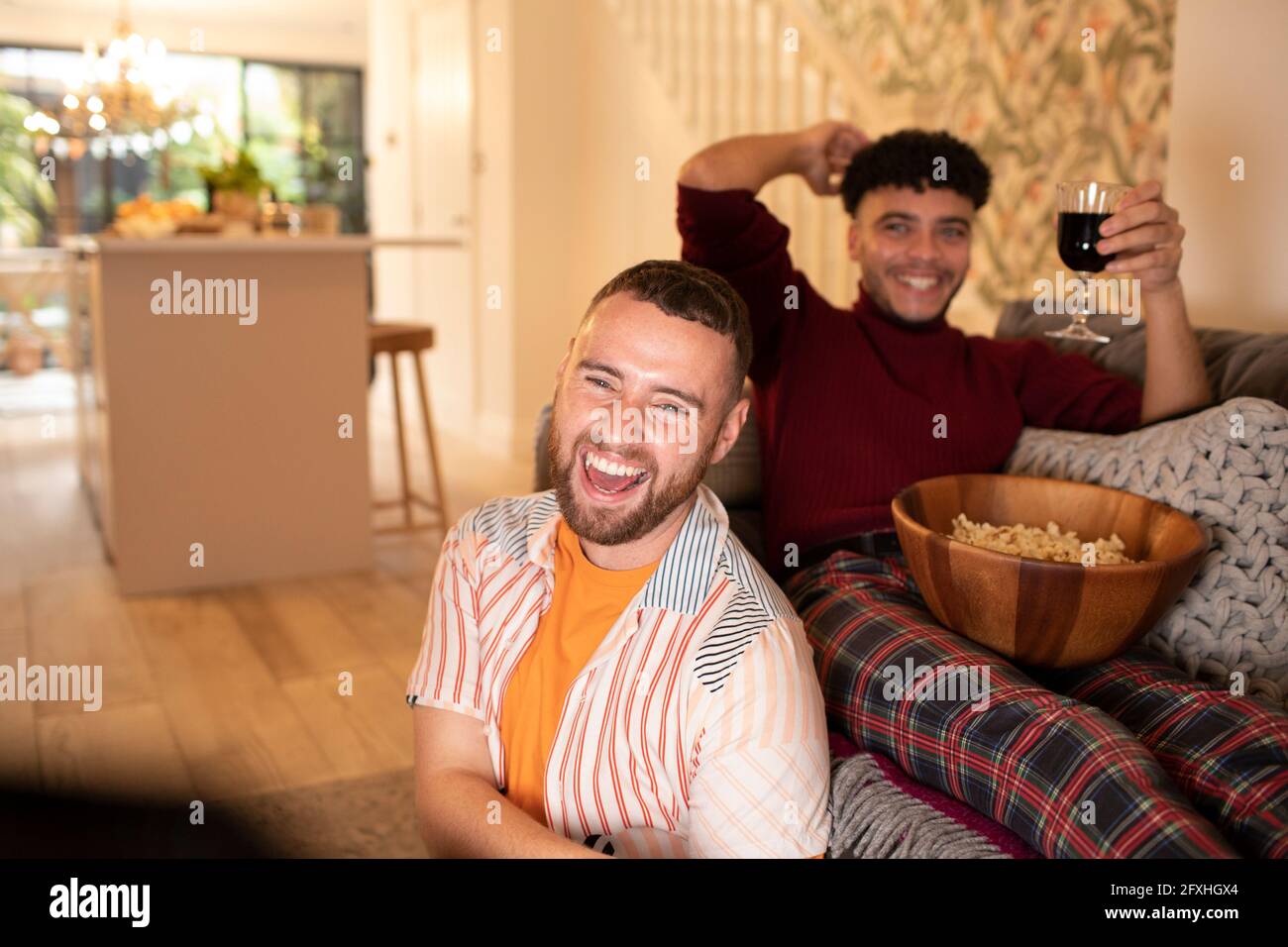 Tag : Happy Gay Male Couple With Wine And Popcorn Laughing And Watching Tv Stock Photo Alamy