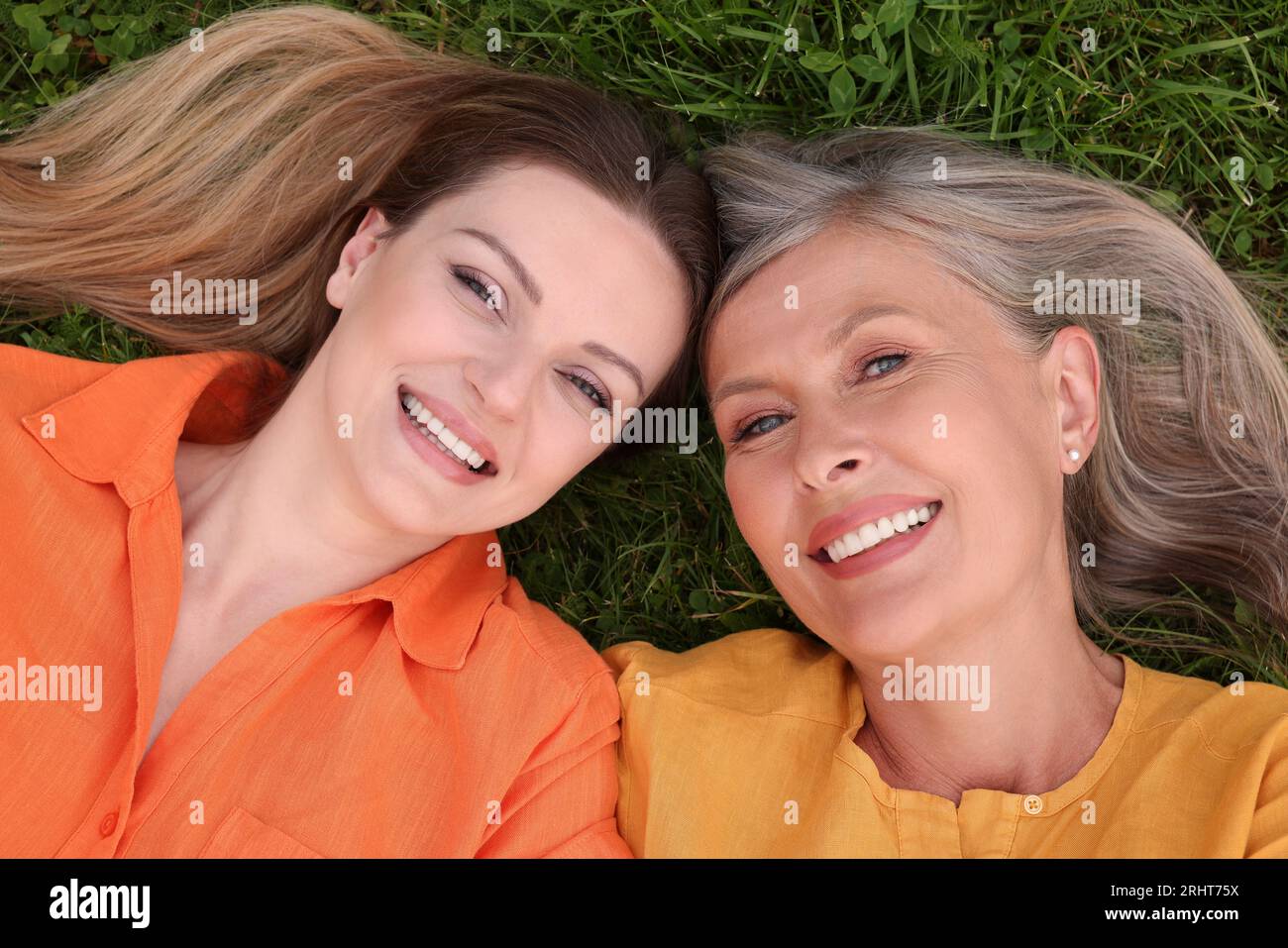 Tag : Happy Mature Mother And Her Daughter Lying On Green Grass Top View Stock Photo Alamy