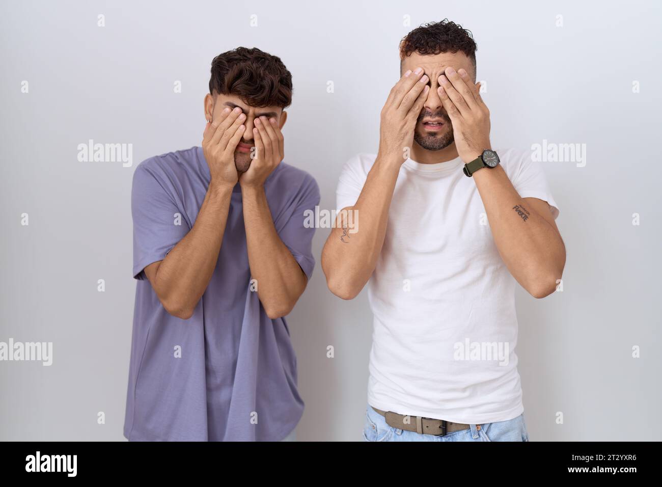 Tag : Homosexual Gay Couple Standing Over White Background Rubbing Eyes For Fatigue And Headache