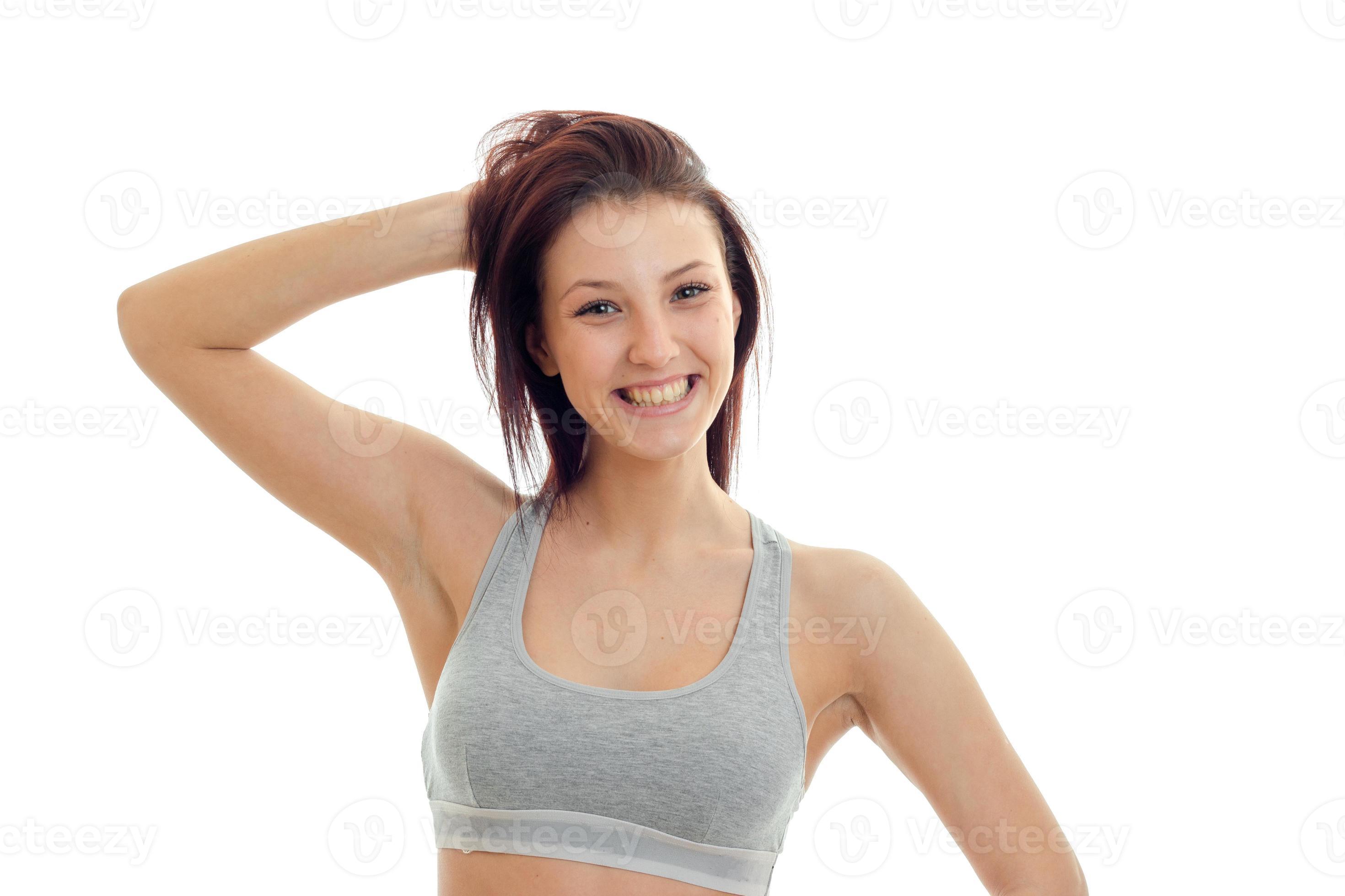 Horizontal Portrait Of Joyous Beautiful Brunette That Stands In A Gray Top Looks Straight And is a popular picture for sexy and hot.