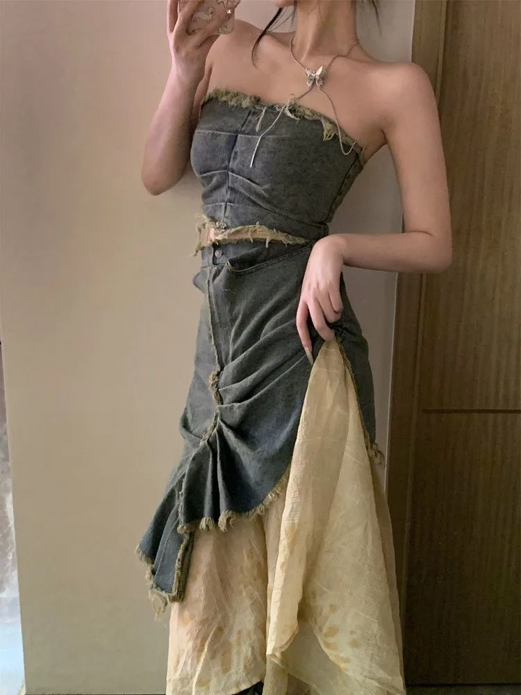 Hot Girl Suits Vintage Strapless Denim Top High Waist Splicing Irregular Midi Skirts Piece is a popular picture for sexy and hot.