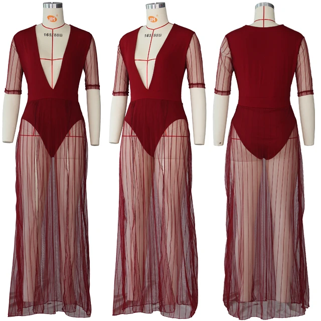 Tag : Hot Sell Deep V Neck Mesh Half Sleeved Legless Clothes Transparent Women Long Beach Dress