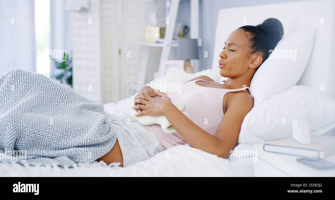 Tag : Hot Water Bottle Woman And Stomach Pain In Home On Bed With Period Cramps Menstruation Or