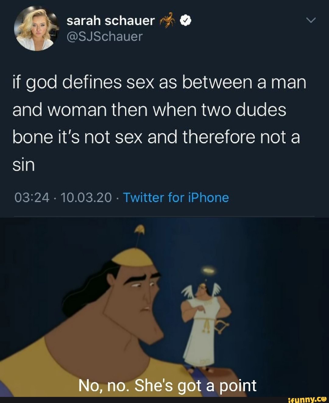 Tag : If God Defines Sex As Between A Man And Woman Then When Two Dudes Bone It S Not Sex And