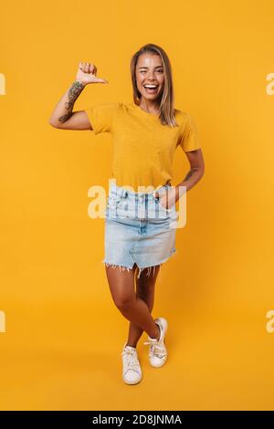 Tag : Image D Une Femme Blonde Joyeuse Qui Se Fait Sauter Et Souffle Baiser D Air Isol Sur Fond Jaune