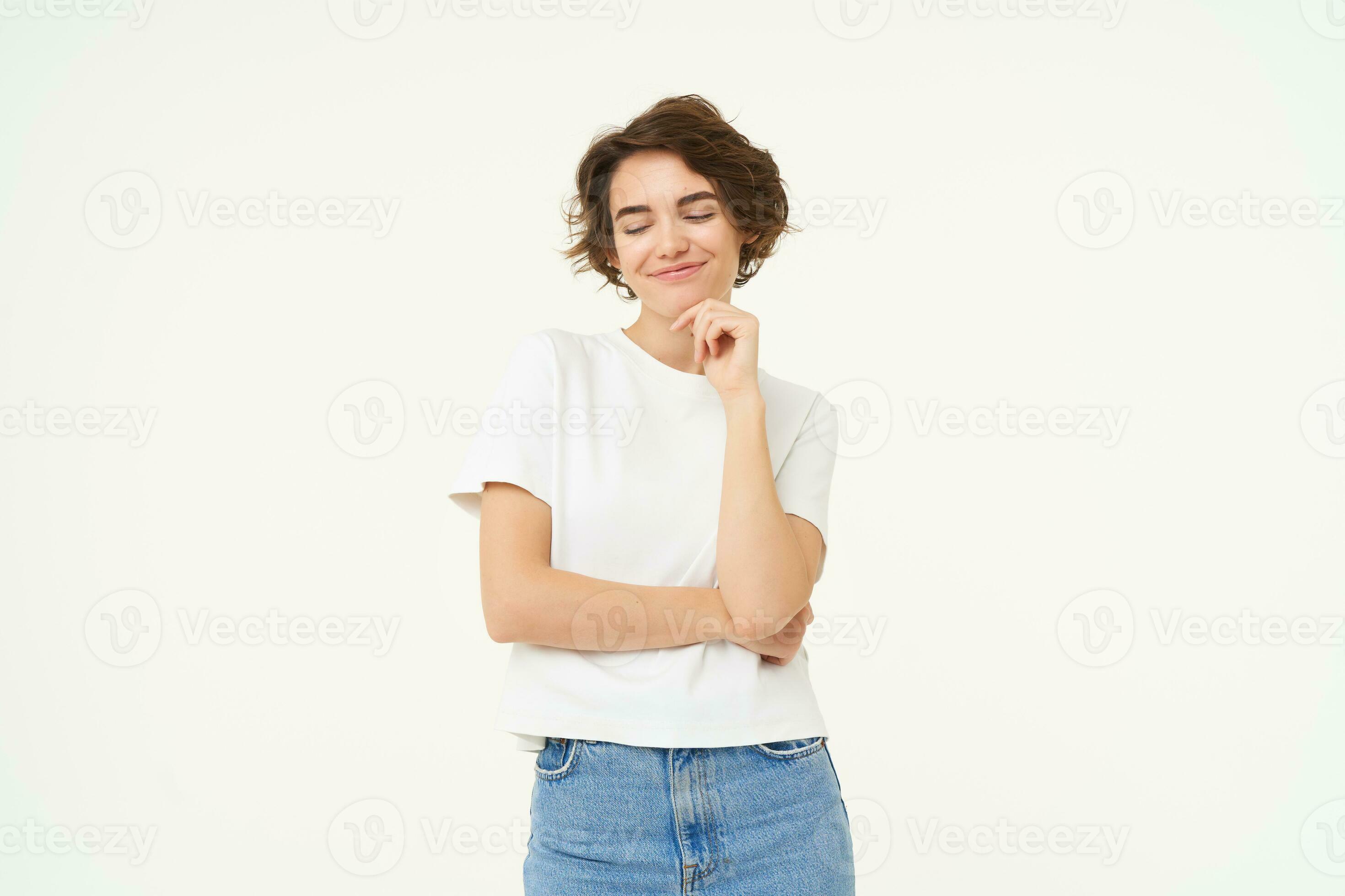Image Of Pleased Smiling Brunette Girl Smirks Looks Down With Confident Satisfied Face is a popular picture for sexy and hot.