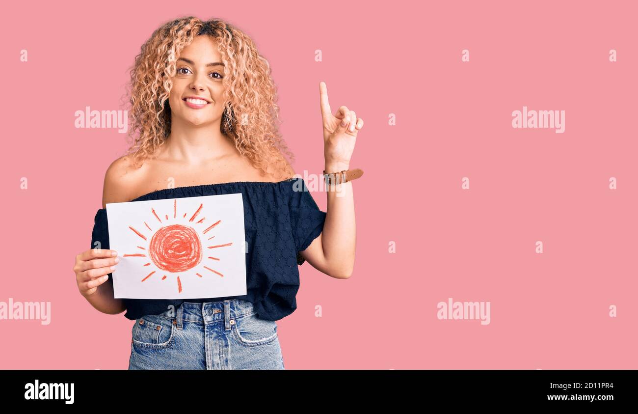 Junge Blonde Frau Mit Lockigen Haaren H Lt Sonne Zeichnen Berrascht Mit Einer Idee Oder Frage is a popular picture for sexy and hot.
