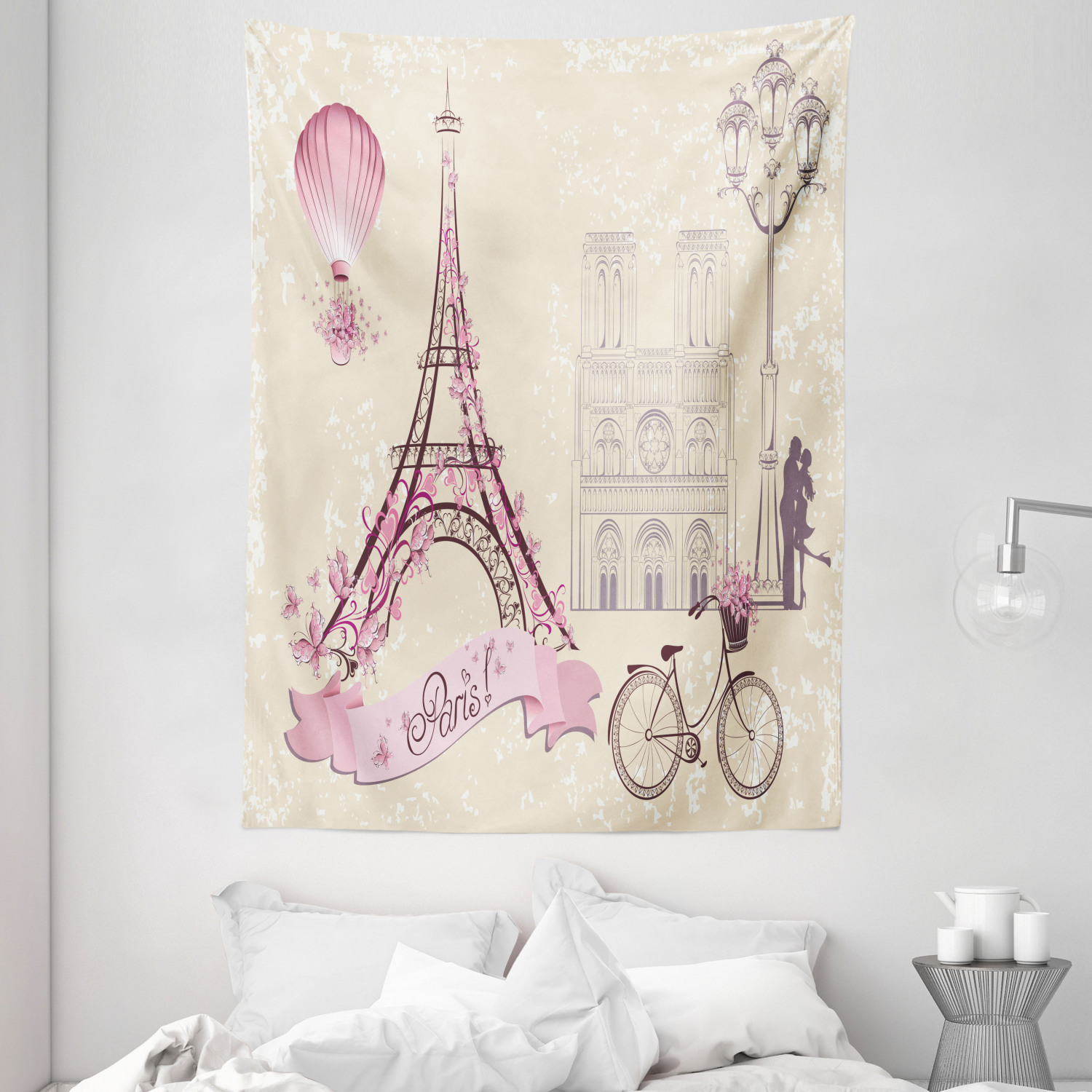 Tag : Kiss Tapestry Floral Paris Symbols Landmarks Eiffel Tower Hot Air Balloon Bicycle Romantic