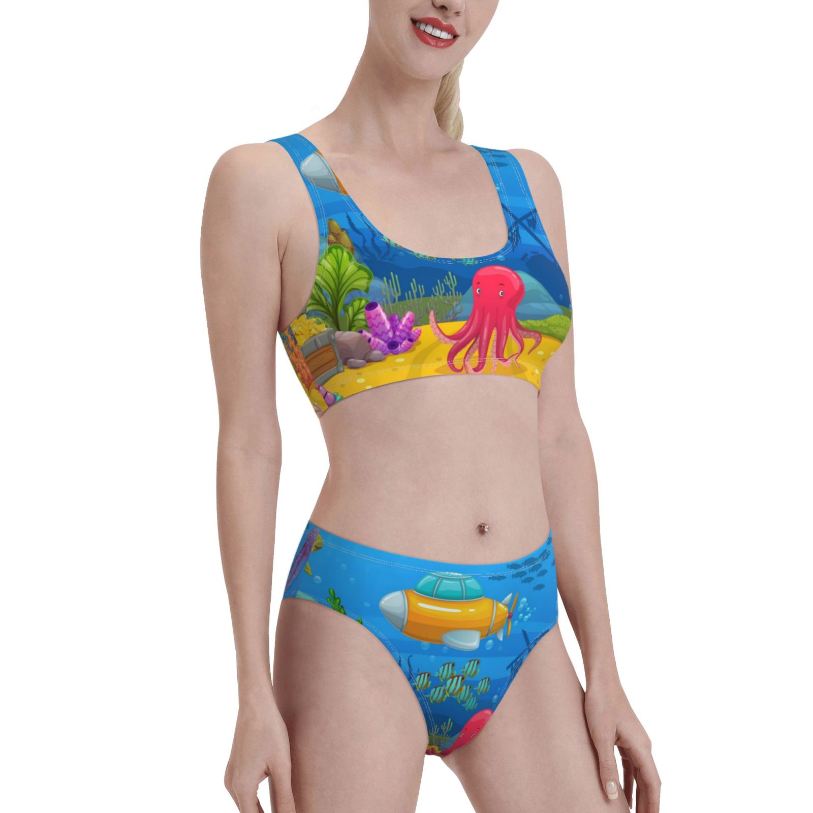 Kll Submarine And Landscape Pattern Women S High Waisted Bikini Sets U Neck Bikini Top Tummy is a popular picture for sexy and hot.