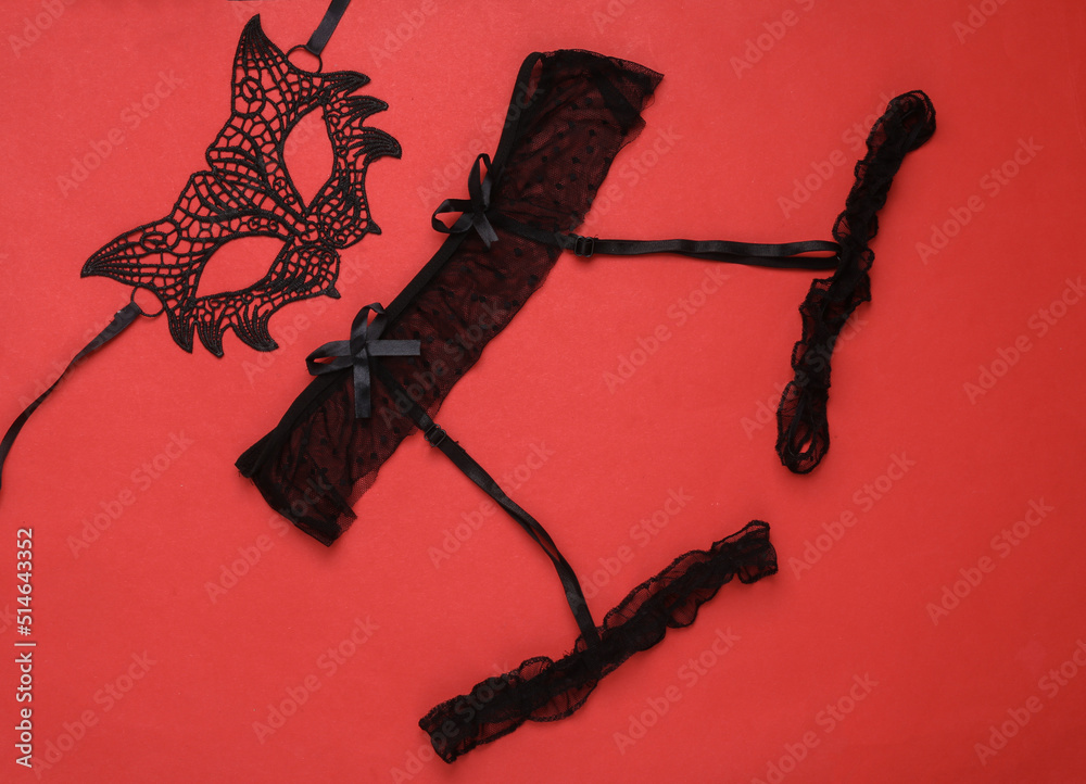 Lacy Cat Mask And Garter Belt On A Red Background Sexy Lingerie Top View Stock Foto Adobe Stock is a popular picture for sexy and hot.