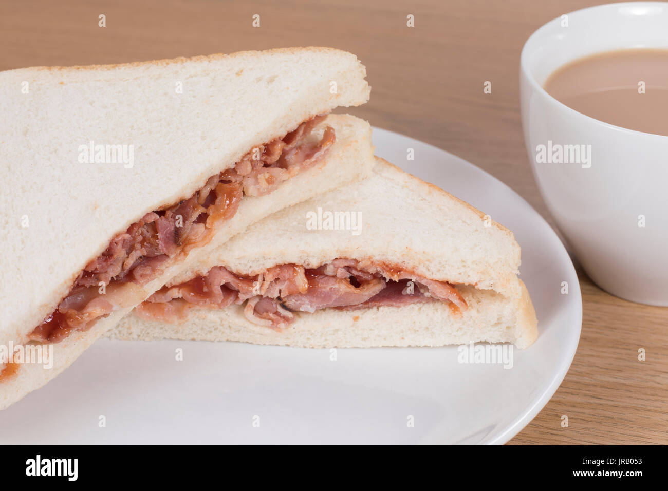 Tag : Lunchtime Snack At The Office With A Tasty Fresh White Bacon Sandwich And Cup Of Hot Tea Stock