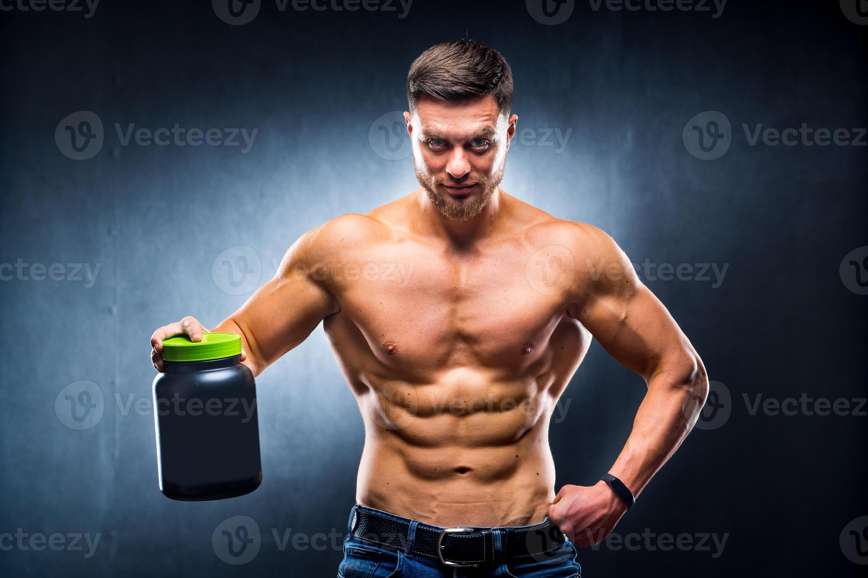 Male Athlete Bodybuilder With A Naked Torso Holds A Jar Of Sports Nutrition In His Hands And is a popular picture for sexy and hot.