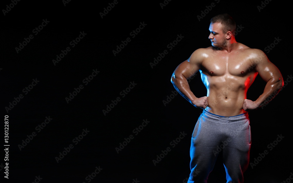 Tag : Male Bodybuilder Athlete With Naked Torso Posing Against A Black Background In Red And Blue