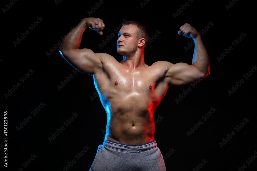 Tag : Male Bodybuilder Athlete With Naked Torso Posing Against A Black Background In Red And Blue