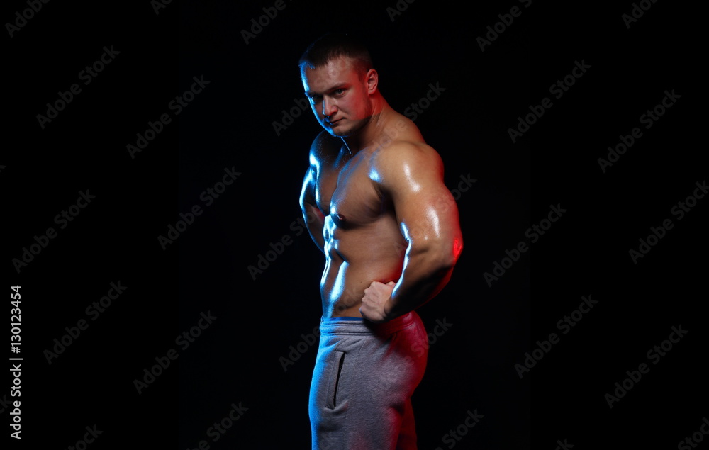 Tag : Male Bodybuilder Athlete With Naked Torso Posing Against A Black Background In Red And Blue