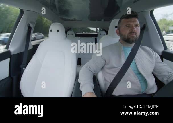 Related pictures for Mature Male Driver Inside Tesla Model Y Car Using Self Drive Autopilot Technology On Sunny