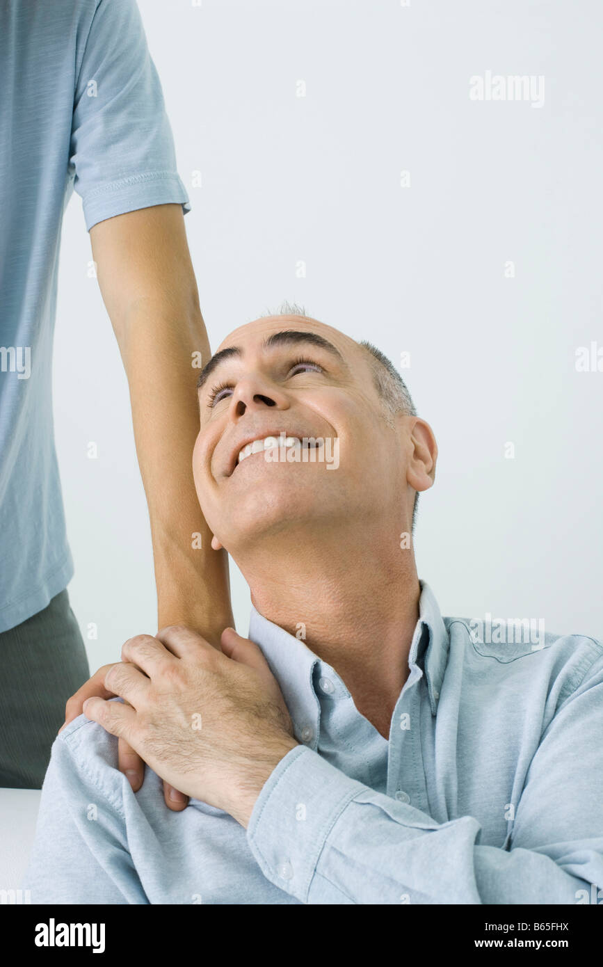Tag : Mature Man Holding Son S Hand On Shoulder Smiling Up Over Shoulder Cropped View Stock Photo