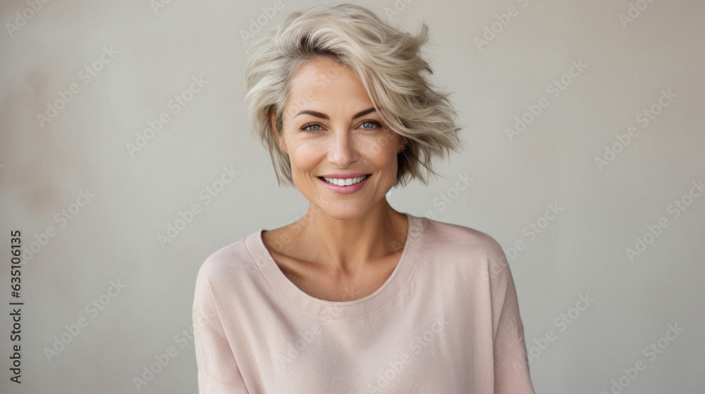 Mid Aged Adult Confident Smiling European Woman With Blonde Short Hair Happy Healthy Attractive is a popular picture for sexy and hot.