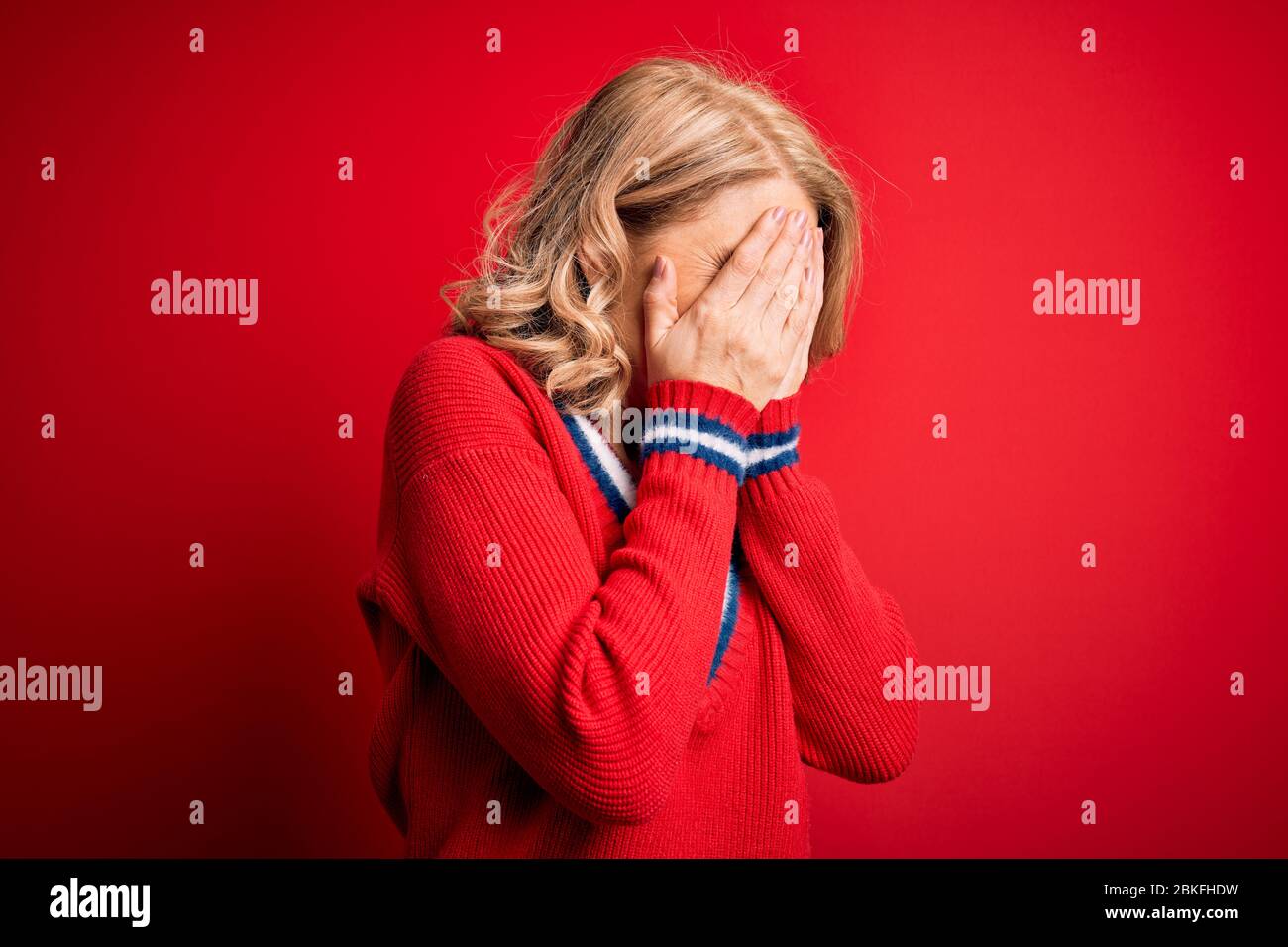 Tag : Middle Age Beautiful Blonde Woman Wearing Casual Sweater Over Isolated Red Background With Sad