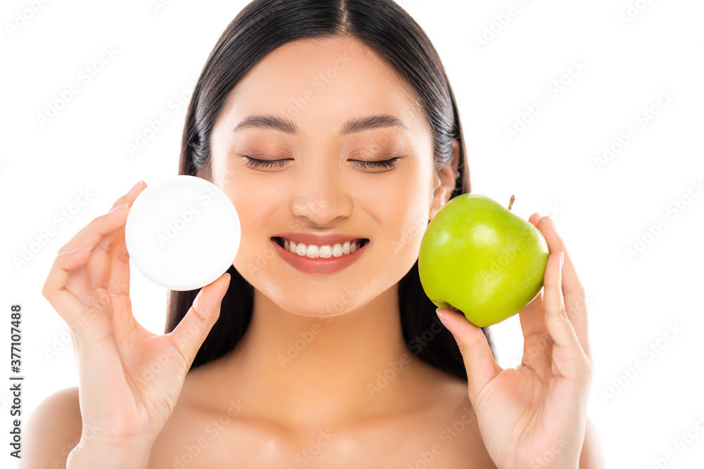 Tag : Naked Asian Woman With Closed Eyes Holding Whole Green Apple And Cosmetic Cream Near Face