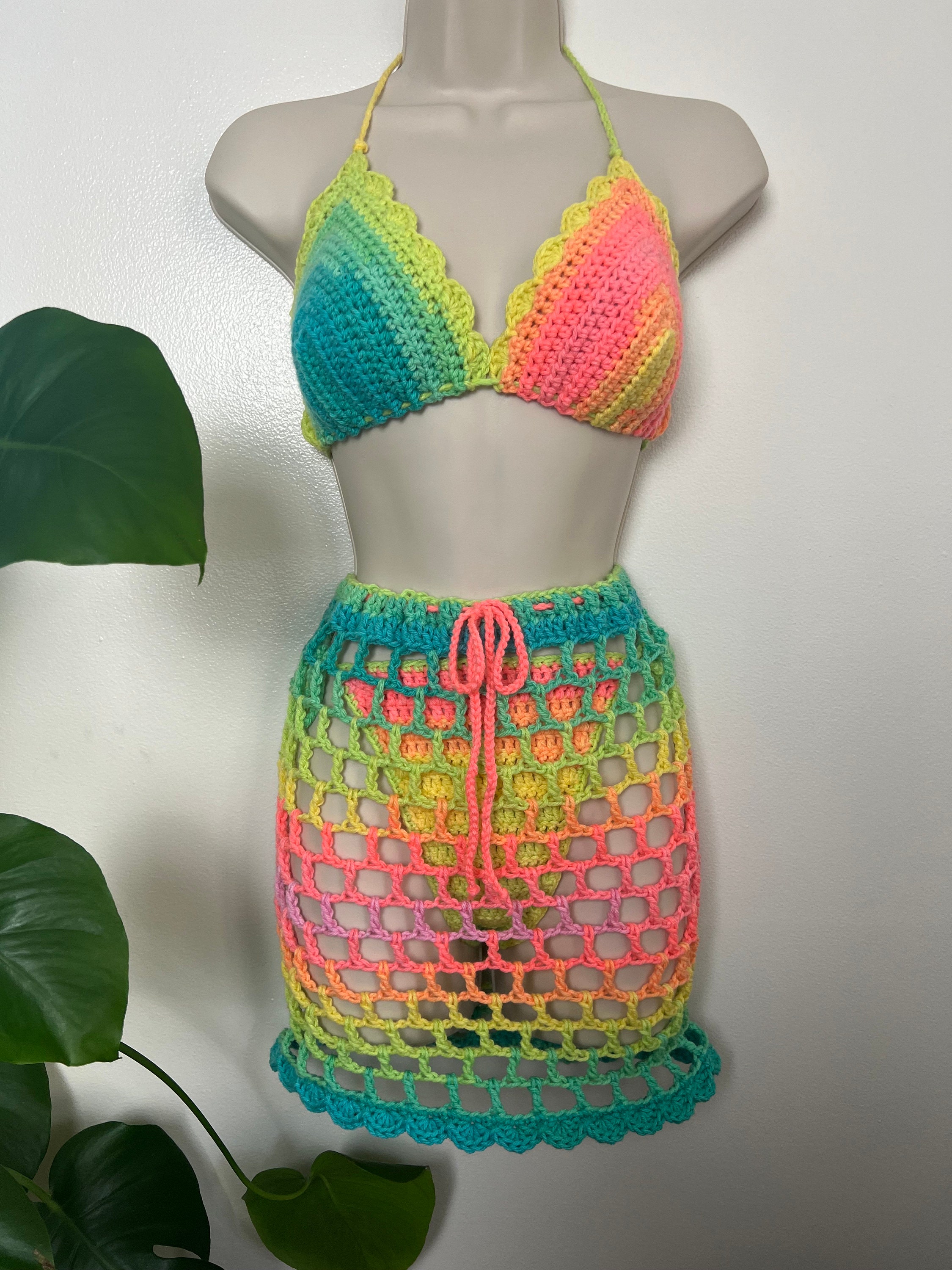 Tag : Neon Rainbow Crochet Summer Bikini Set With Cover Up Mesh Skirt Crochet Bra Top Crochet