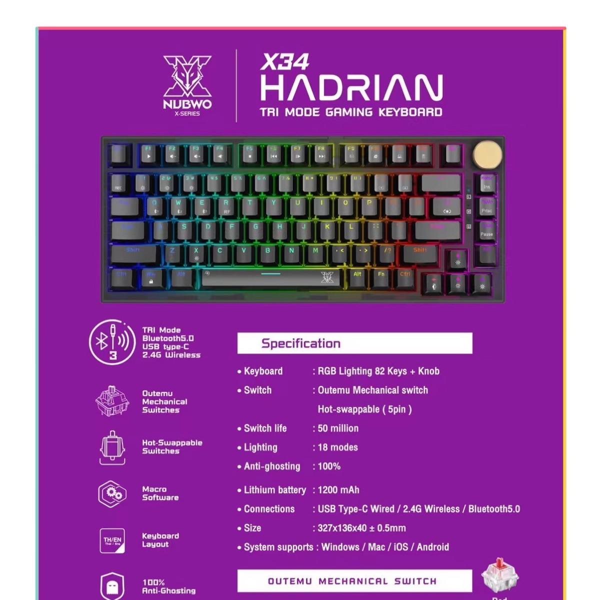 nubwo x34 hadrian mechanical hot swap 82ปม เชอมตอได แบบ บลทธ ไรสาย 2 4G สาย type c