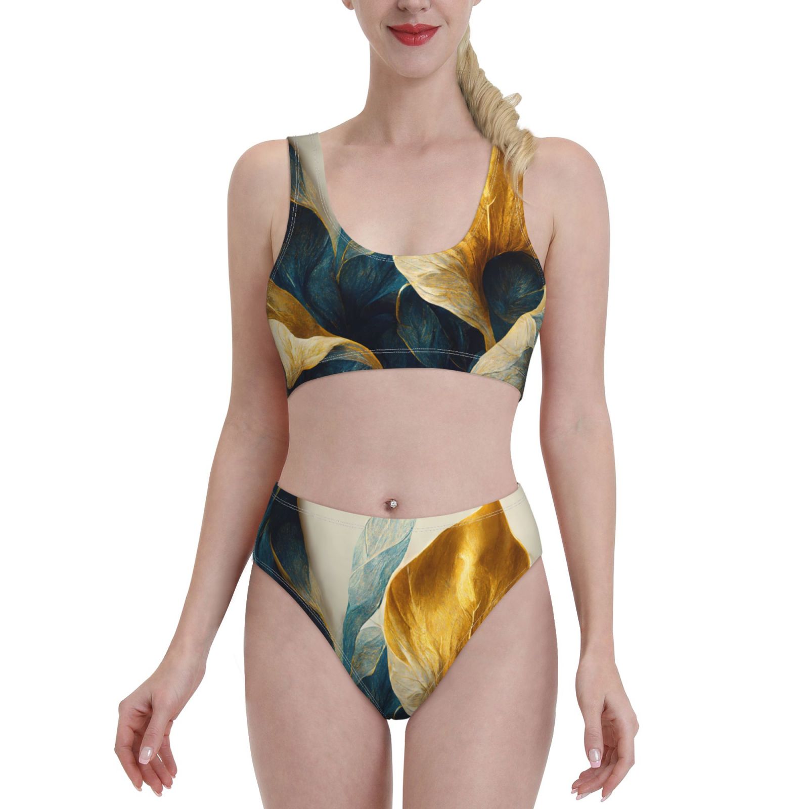 Ocsxa Golden Blue Leaf Design Women S High Waisted Bikini Sets Sporty Two Piece Swimsuits is a popular picture for sexy and hot.