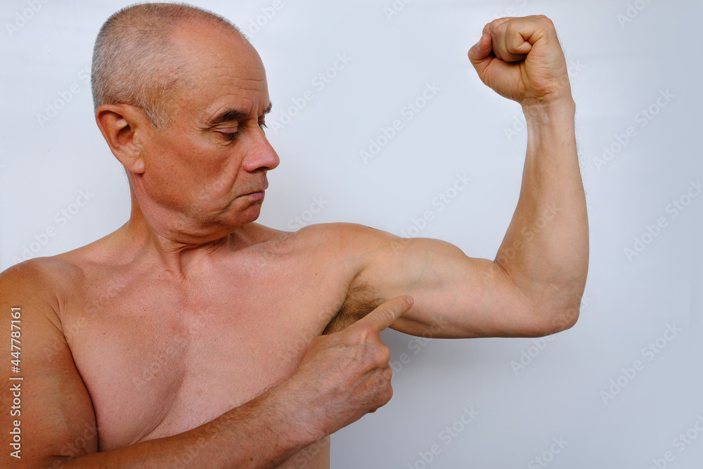 Tag : Old Man With A Naked Tanned Torso Senior Strains The Pumped Up Muscles Of The Arm Demonstrates