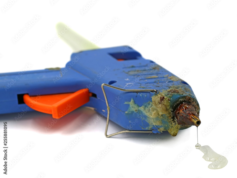 Tag : Old Used Hot Glue Gun With Focus On Melted Glue Dripping Out Isolated On White Background Stock