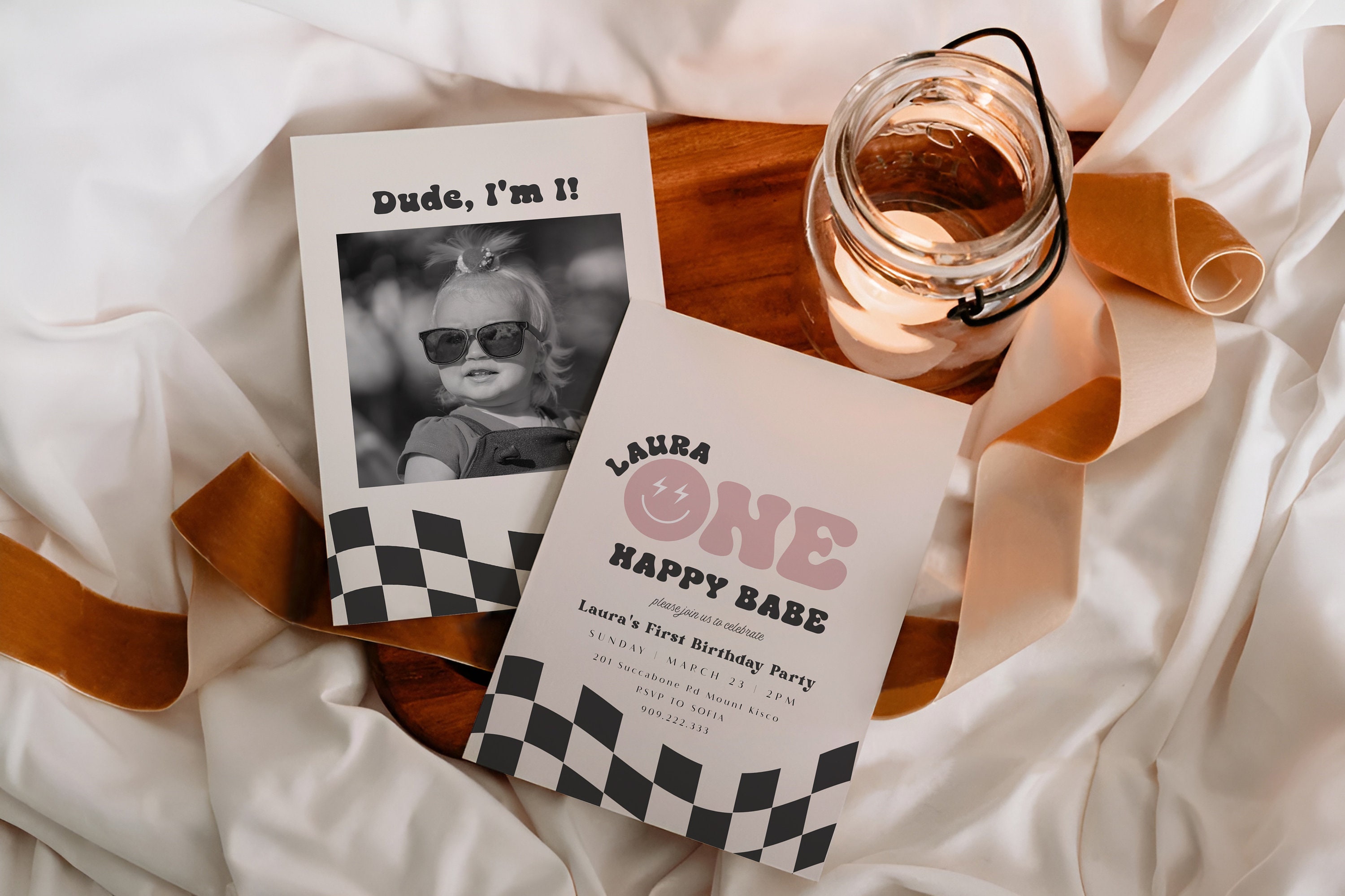 One Happy Babe Birthday Party Invitation Retro Smiley Face First Birthday Sweet Baby Theme One