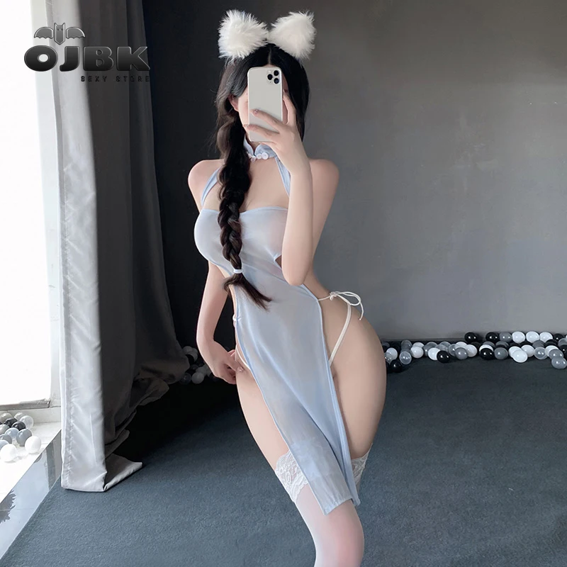 Tag : Paloli Stylish And Sexy Halter Cheongsam Inspired Lingerie Black Pink Light Blue Woman High Slit