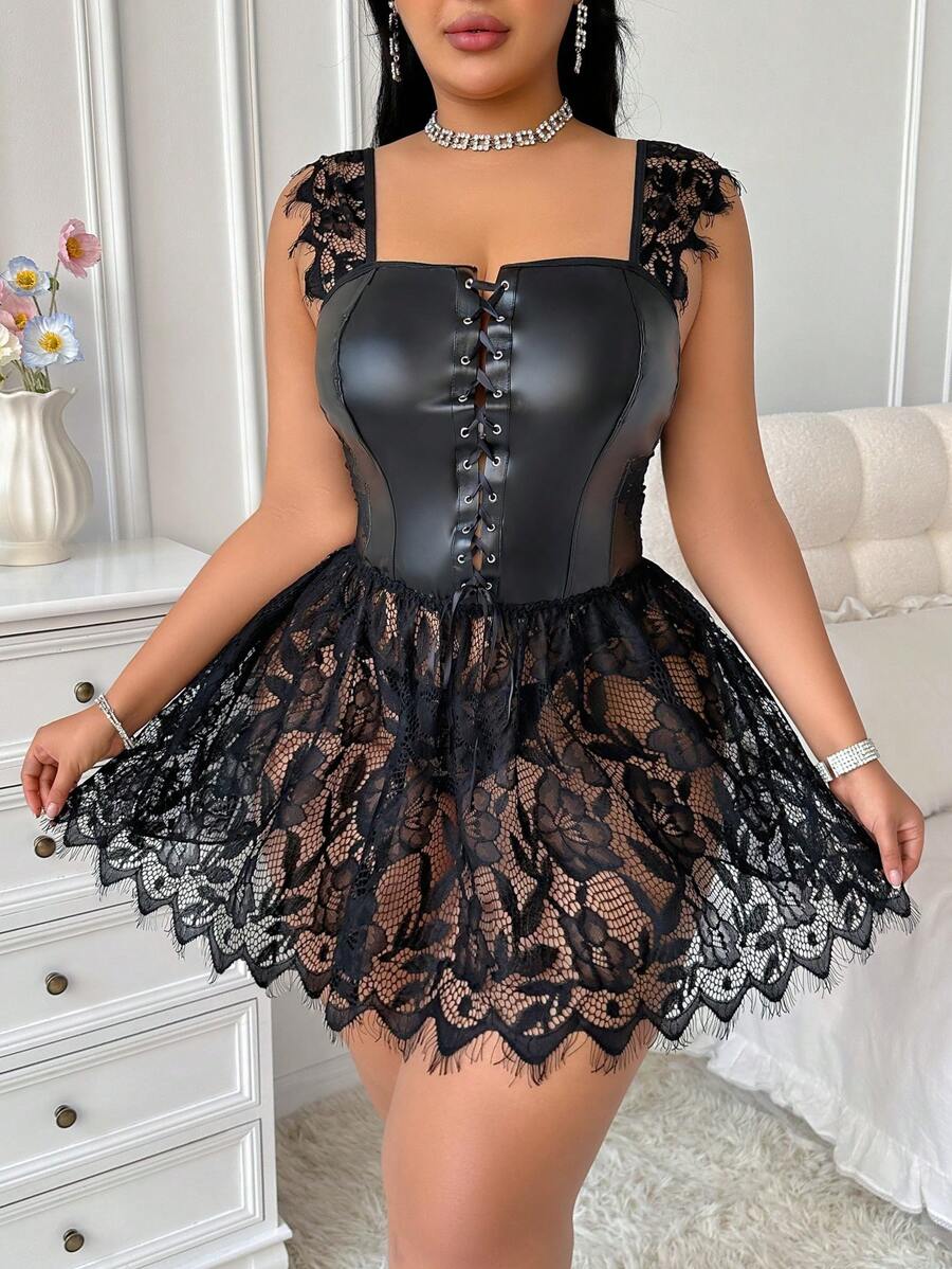 Pcs Set Lace Pu Splice Music Festival Lingerie Strap Dress Thong Plus Size Sexy For Sale is a popular picture for sexy and hot.