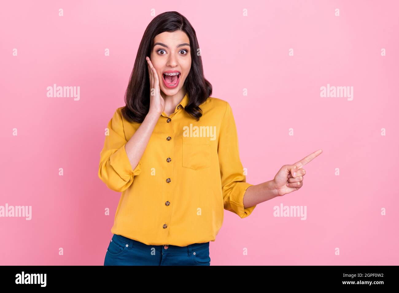 Photo Of Impressed Brunette Hairdo Millennial Lady Point Empty Space Wear Yellow Shirt Isolated is a popular picture for sexy and hot.