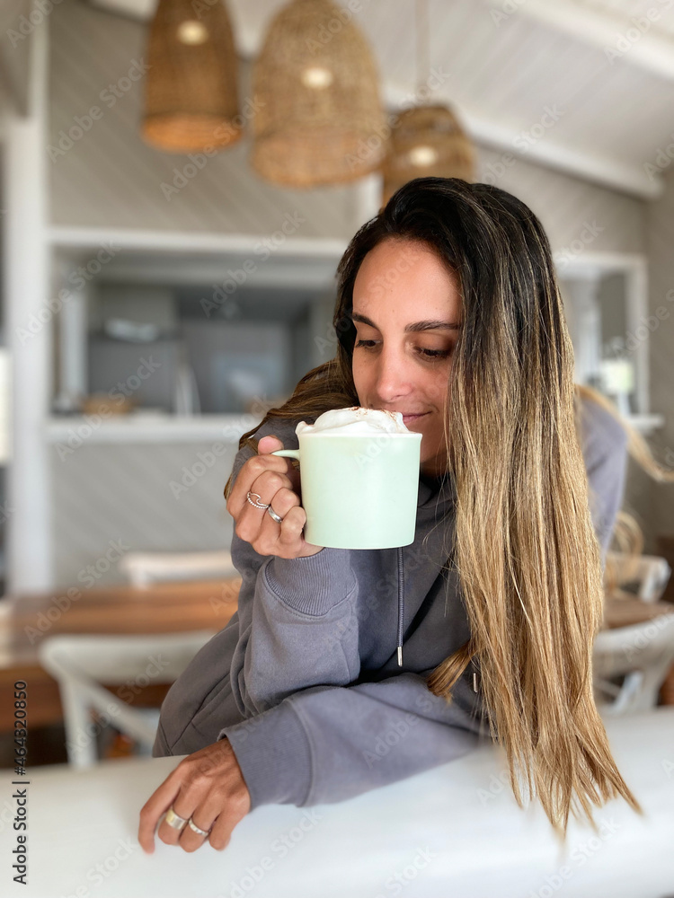 Tag : Photo Stock Ni A Latina Tomando Una Taza De Chocolate O Caf Caliente Y Muy Espumoso Lleva