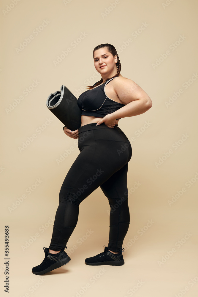 Tag : Plus Size Model Big Woman In Black Sportswear Full Length Portrait Smiling Brunette Holding