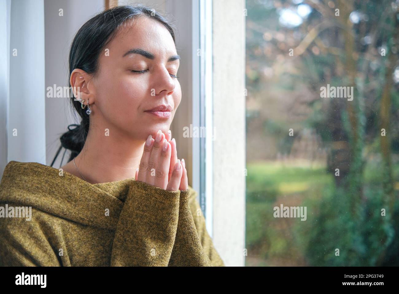 Tag : Portrait D Une Femme De Latina En Un Moment De Pri Re Son Domicile Elle Est Debout Ou Assise