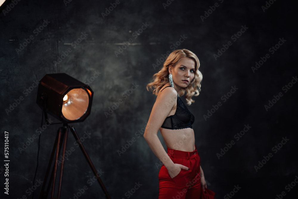 Portrait Of Candid Authentic Elegant Sexy Model Blonde Girl Posing In Bra And Red Pantsuit At is a popular picture for sexy and hot.