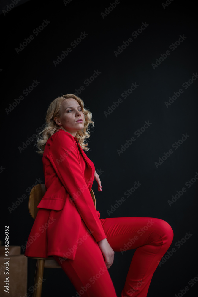 Tag : Portrait Of Candid Authentic Elegant Sexy Model Blonde Girl Posing In Bra And Red Pantsuit At