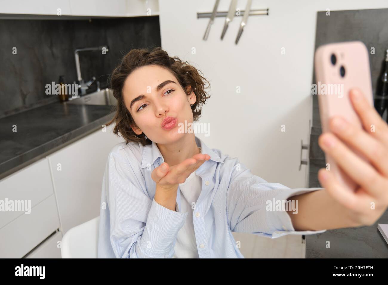Portrait Of Cute Brunette Woman Takes Selfie Sends Kisses At Smartphone Camera Records Video is a popular picture for sexy and hot.