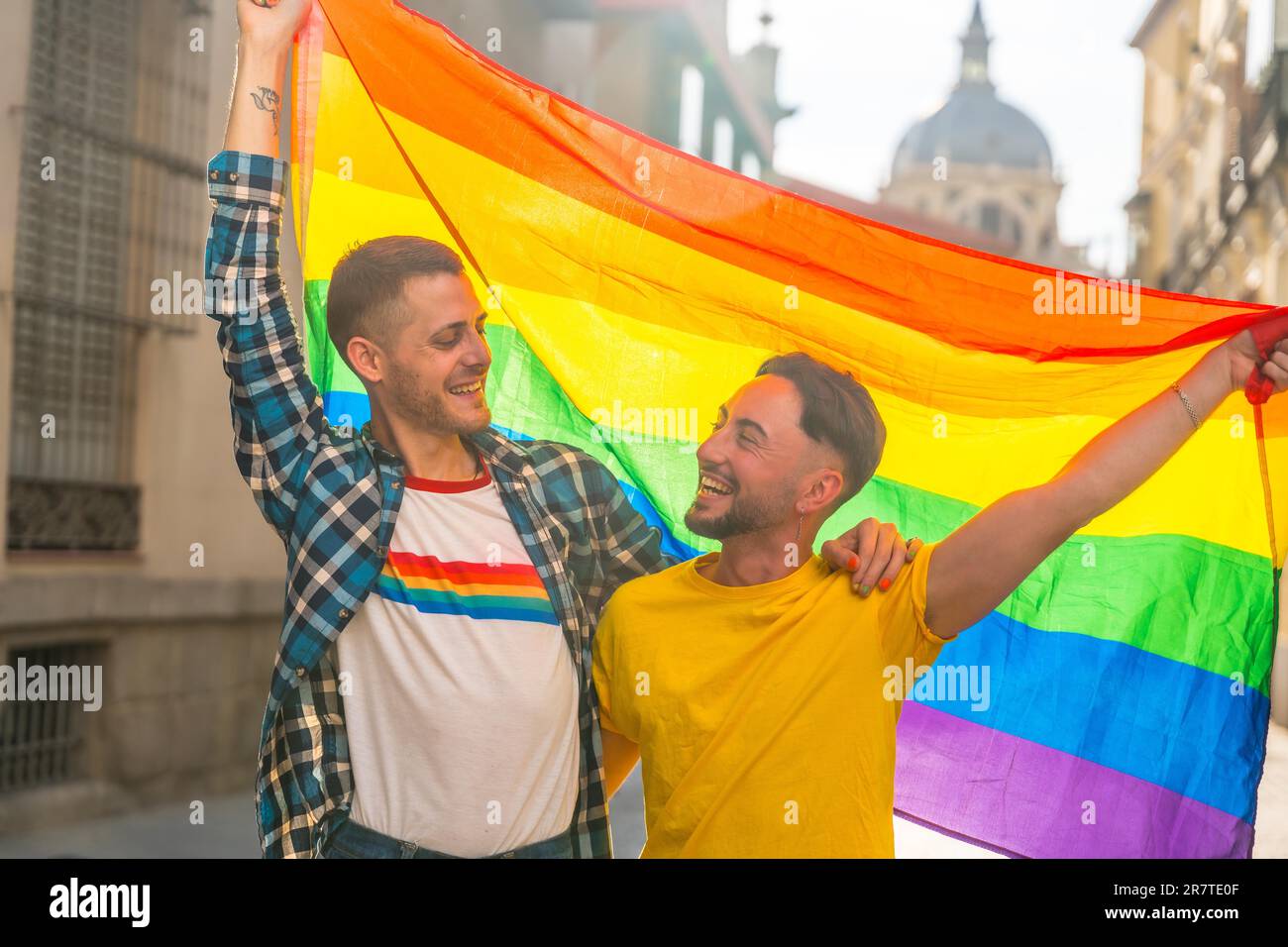 Portrait Of Gay Male Couple With Rainbow Flag At Pride Party In The City Lgbt Concept Stock is a popular picture for sexy and hot.