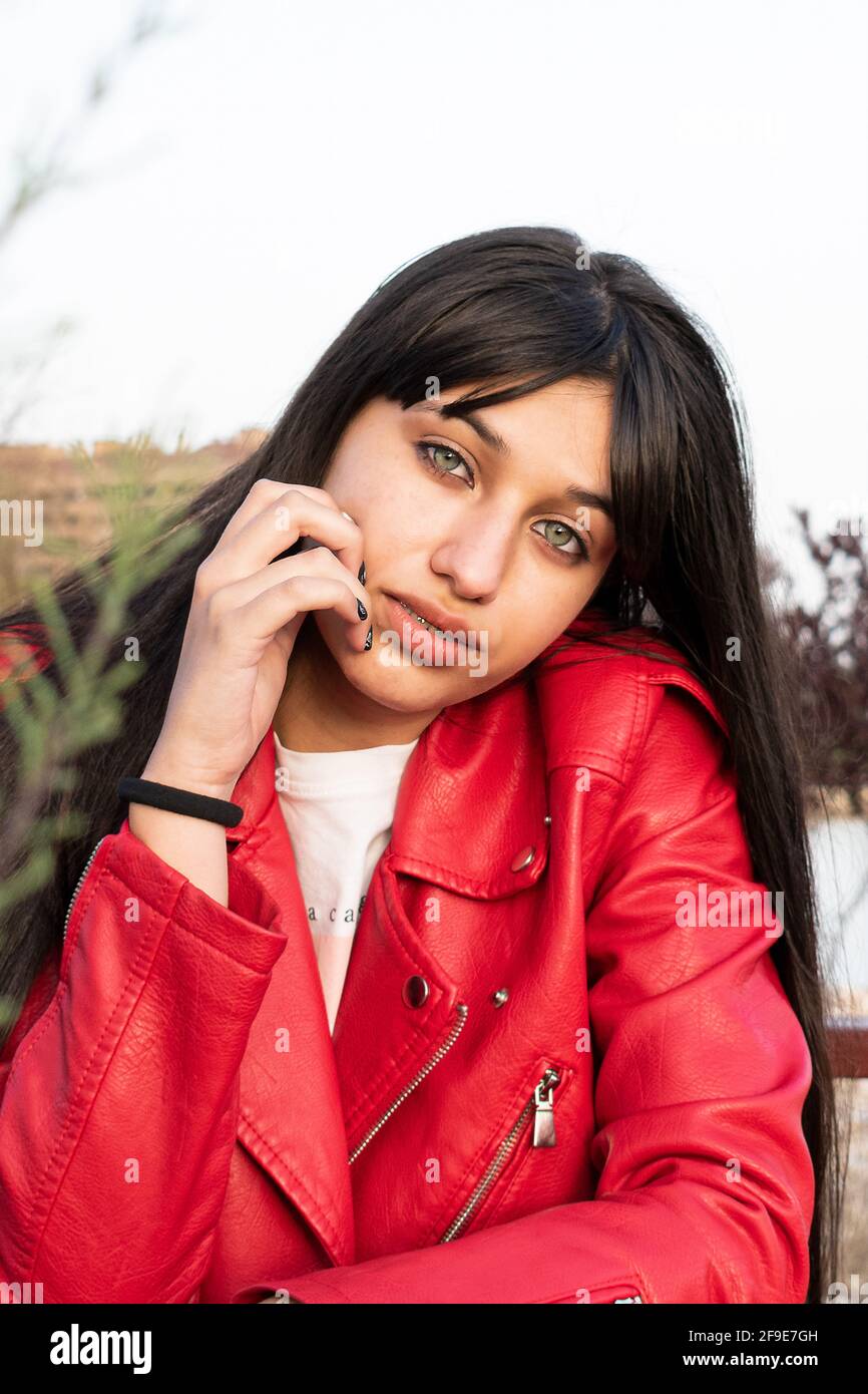 Tag : Portrait Of Green Eyed Latina Teenager In The Park With Red Leather Jacket Stock Photo Alamy