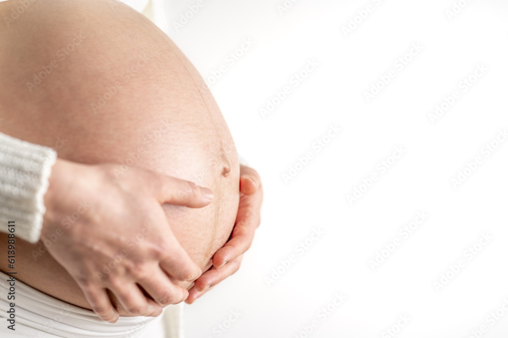 Tag : Pregnant Woman Gently Holding Her Naked Round Belly With Her Hands In Final Month Of Pregnancy